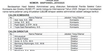 AMPAR.ID, JAMBI – Panitia seleksi (pansel) resmi mengumumkan 4 nama Calon Komisaris dan 10 nama Calon Direktur lolos seleksi administrasi (tahap awal) PT Jambi Indoguna Internasional (JII). Pengumuman itu Nomor 009/PANSEL.JII/VI/2025 yang ditandatangani Ketua Pansel Dr.H.Sudirman, SH,MH pada 30 Juni 2025. 4 nama calon komisaris: 1. Abd. Aziz,SE,MM 2. Anhar, SE,ME 3. Padli Saleh, S.STP,M.Si … Lanjutkan membaca 14 Nama Lolos Seleksi Tahap Awal Calon Komisaris dan Direktur BUMD PT JII, Lanjut Psikotes dan Tes Tertulis