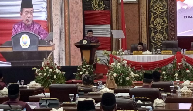 Al Haris saat menyampaikan sambutan pada paripurna HUT ke 67 provinsi Jambi di gedung DPRD Provinsi Sabtu 6 Januari 2024/ ( Foto: Alan)