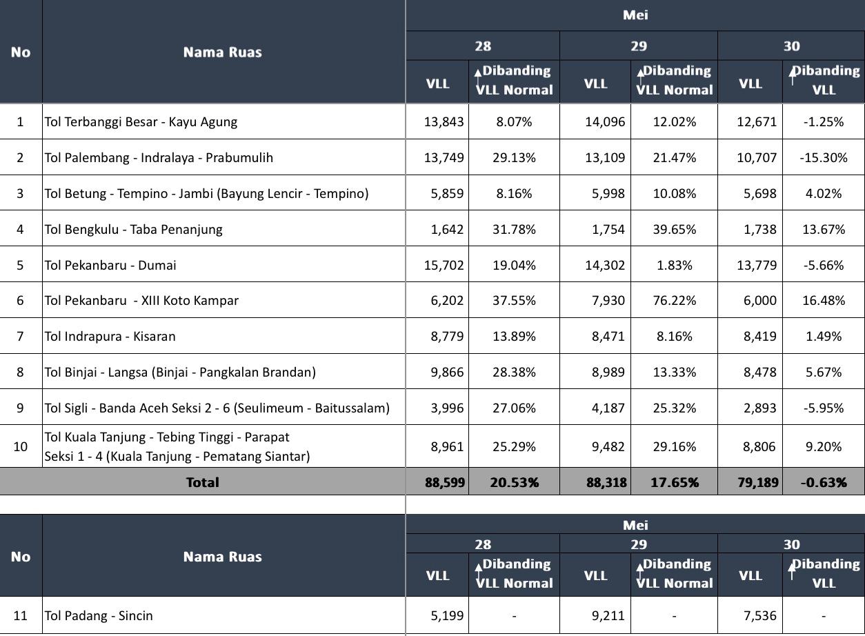 Rincian jumlah kendaraan di masing-masing ruas tol dapat dilihat pada tabel terlampir.
