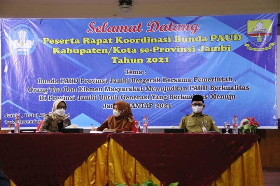 Sebelumnya Laporan Ketua Penyelenggara yang merupakan Ketua Dharma Wanita Persatuan (DWP) Provinsi Jambi Hj. Iin Kurniasih Sudirman menyampaikan Rapat kKoordinasi bertujuan dalam rangka peningkatan pendidikan yang diselenggarakan untuk mengembangkan pribadi, pengetahuan, dan keterampilan yang melandasi pendidikan dasar serta mengembangkan diri secara utuh sesuai dengan asas pendidikan sedini mukin, Rakor dilaksanakan selam 2 hari yang diikuti oleh Bunda Paud Kabupaten/kota se-Provinsi Jambi.