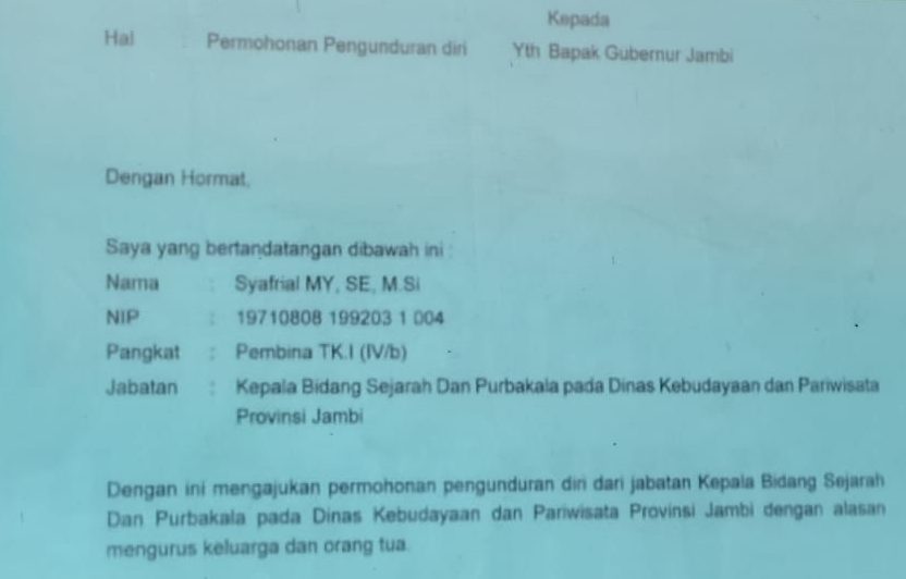 “‎Dengan ini mengajukan pengunduran diri dari jabatan kepala bidang sejarah dan purbakala pada dinas kebudayaan dan pariwisata provinsi Jambi dengan alasan MENGURUS KELUARGA DAN ORANG TUA,” katanya meniru bunyi surat tersebut.