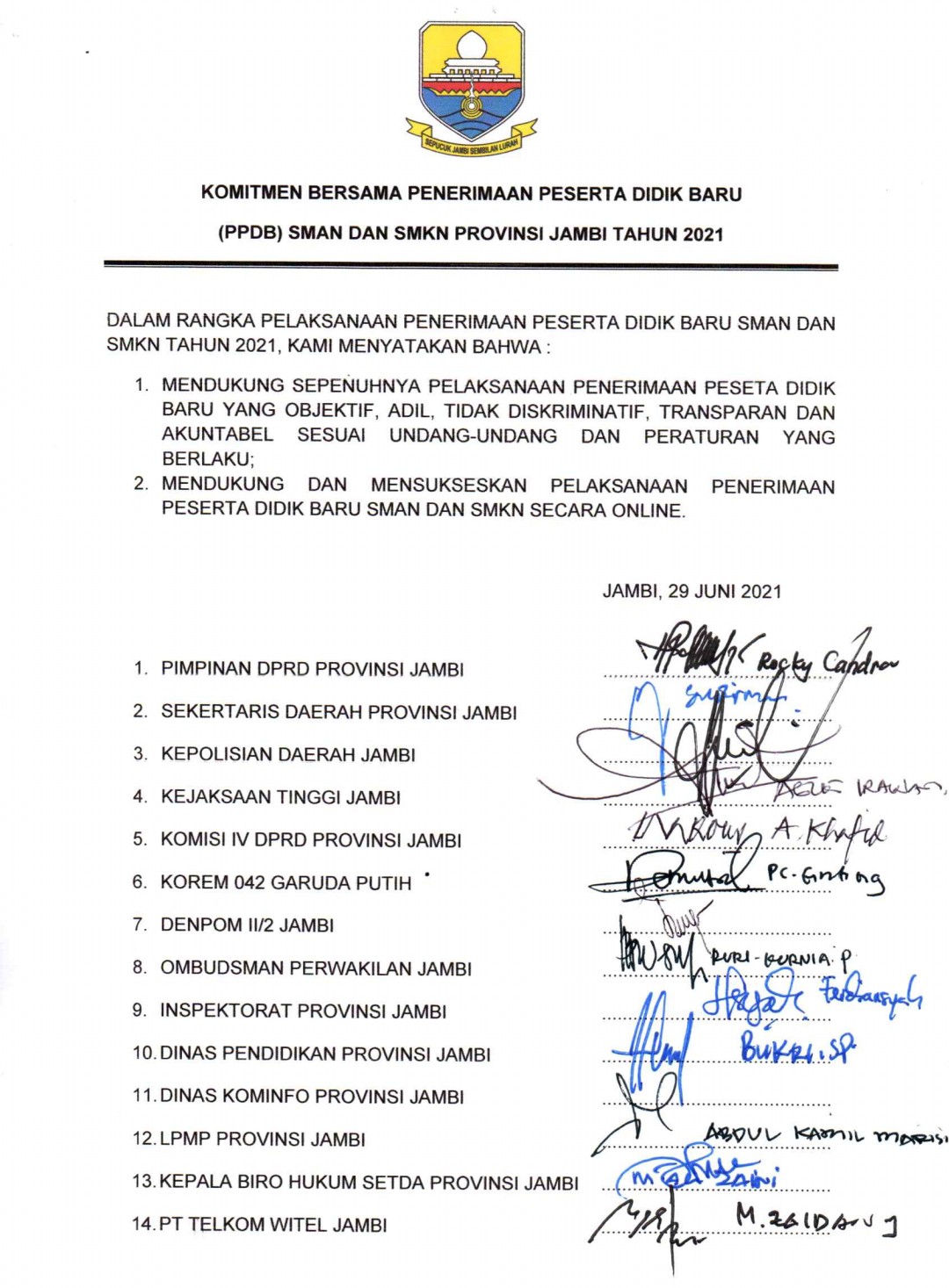 Tak sampai disitu berbagai komponen juga ikut dalam menjaga komitmen bersama PPDB online atau daring SMAN/SMKN Jambi 2021 seperti Pimpinan DPRD provinsi Jambi, Sekda Provinsi Jambi, Kapolda Jambi, Kejati Jmabi, Komisi IV DPRD provinsi Jambi, Korem 042/Gapu, Denpom II/2 Jambi, Ombudsman perwakilan Jambi, Inspektorat provinsi Jambi, Dinas Pendidikan provinsi Jambi, Dinas Kominfo provinsi Jambi, LPMP provinsi Jambi, Kepala Biro Hukum Setda provinsi Jambi, PT Telkom Witel Jambi.