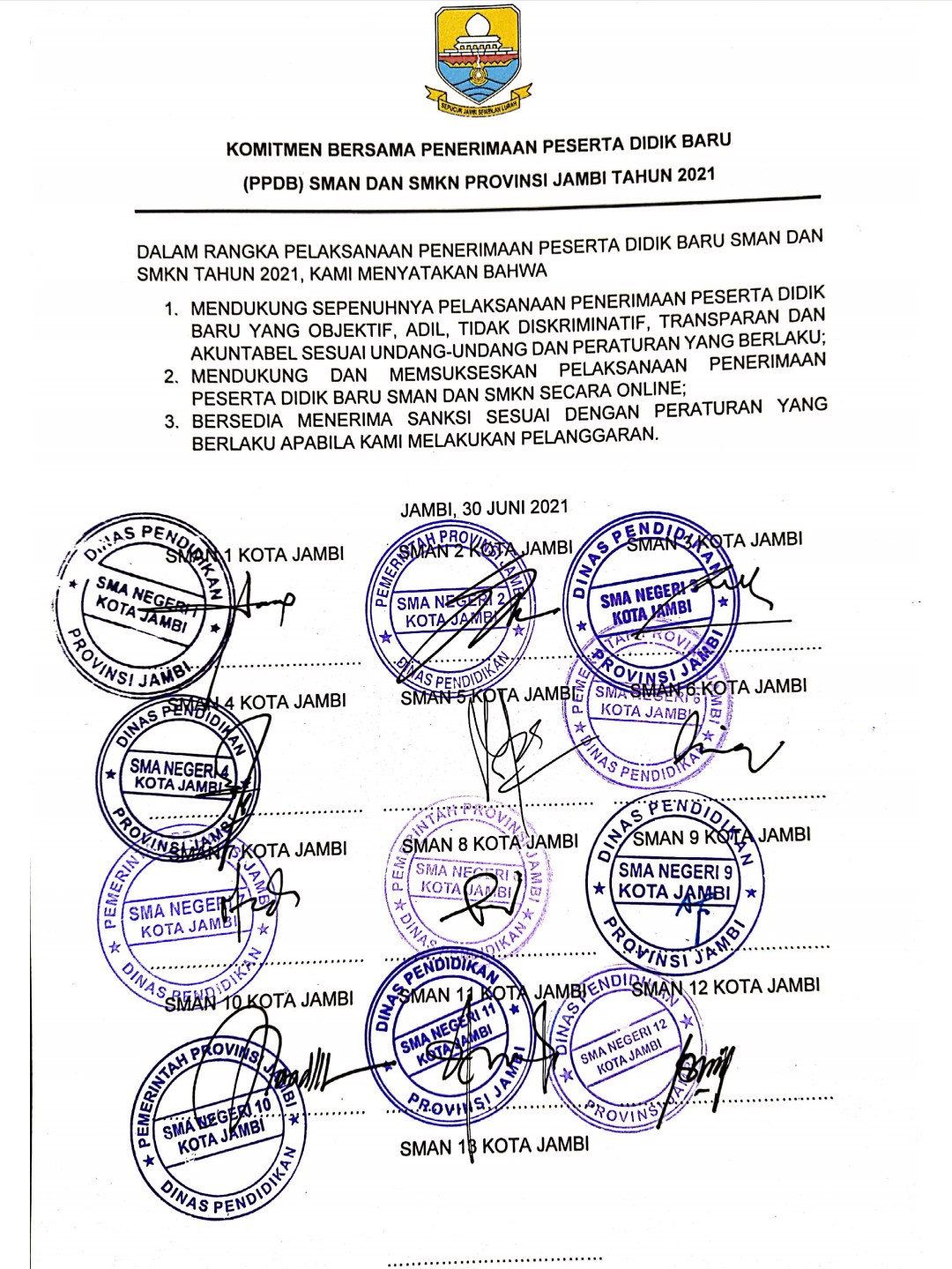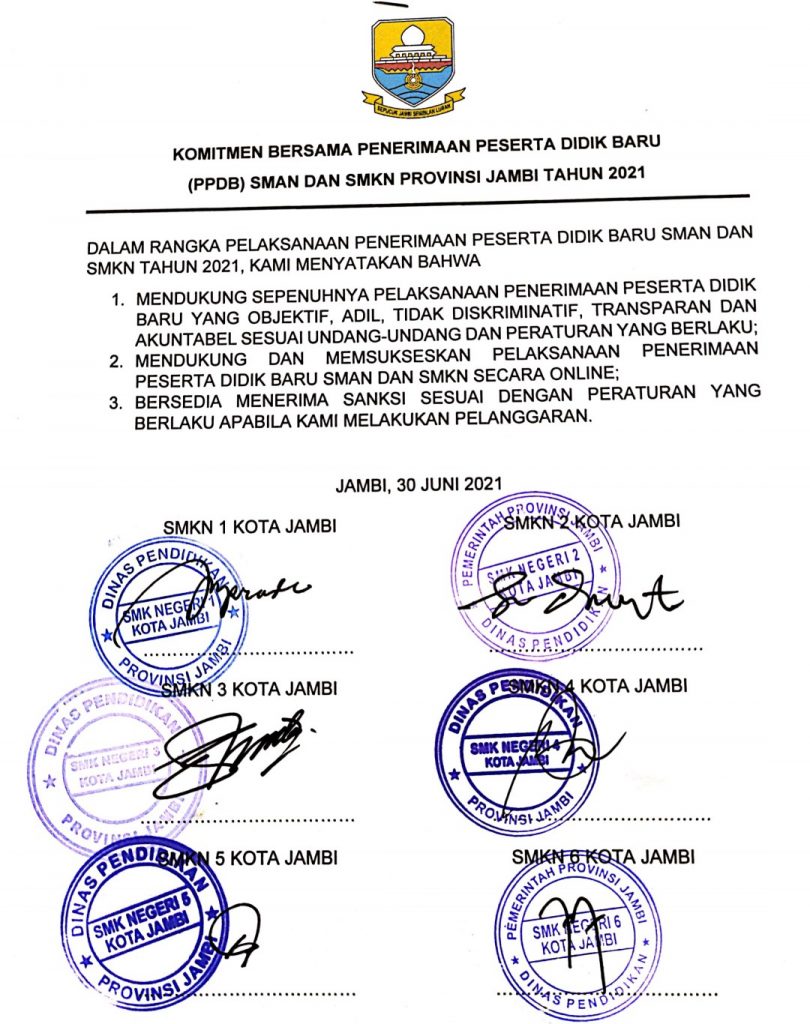 Jauh sebelumnya sebanyak 12 SMAN dan 6 SMKN di Kota Jambi telah menandatangani Komitmen bersama pada 30 Juni 2021 dalam rangka pelaksanaan peneriamaan Peserta Didik Baru SMAN/SMKN Tahun 2021