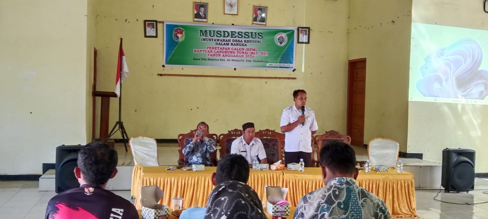 Rabu 10 september 2025 yang bertempat di Aula kantor Desa Tirta Makmur kecamatan Air manjunto telah di Adakan Rapat musdesus yang di adakan oleh PEMDES Tirta Makmur terkait perekrutan Calon ( KPM) 2026.