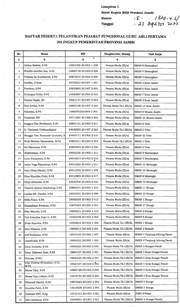 Berikut nama dan jabatan 41 pejabat fungsional guru lingkup pemerintah provinsi Jambi: