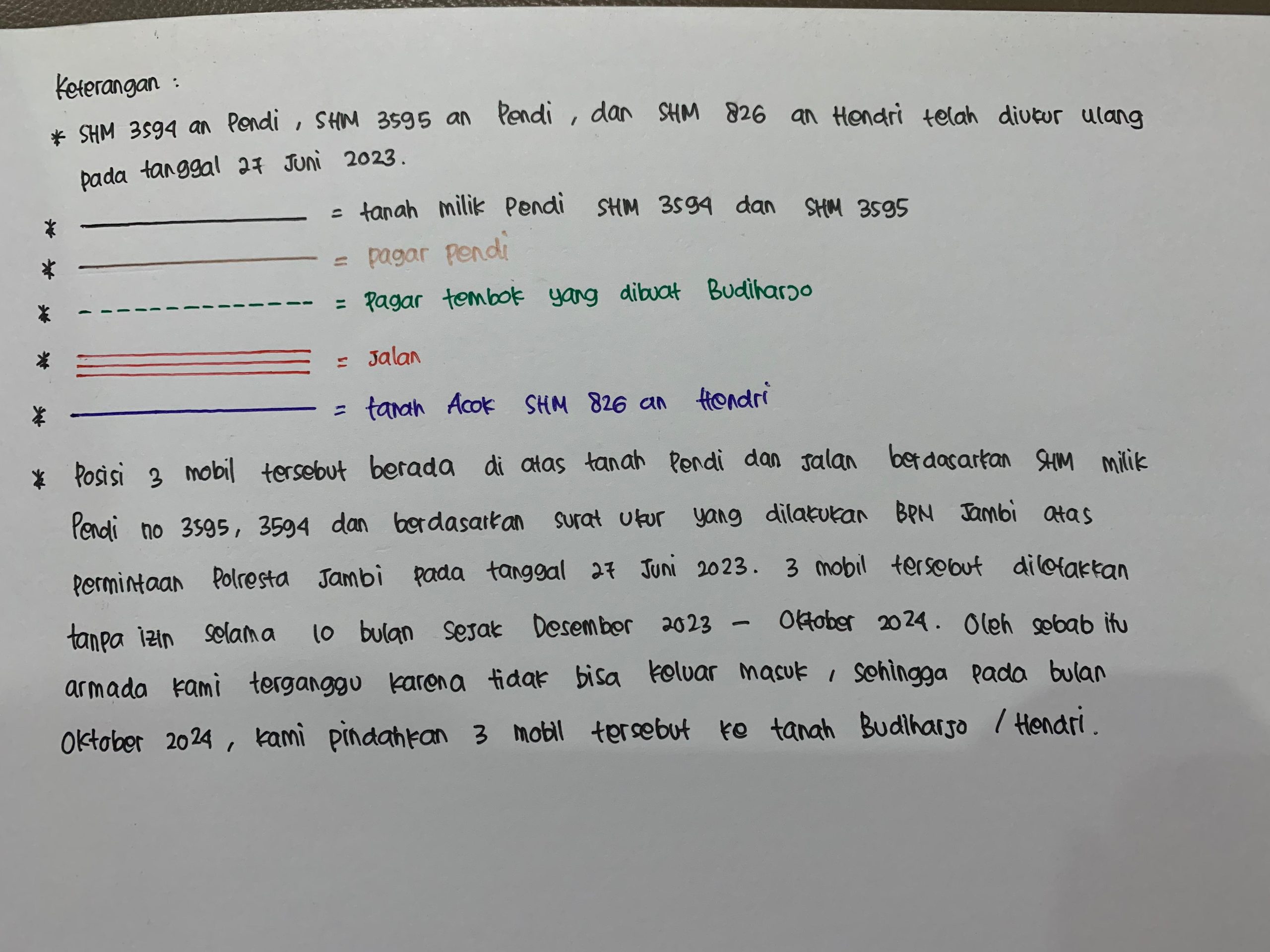 Terlebih lagi, bukti peta pengukuran resmi dari negara memperlihatkan bahwa Ko Pendi justru sedang mempertahankan tanah miliknya yang sah, dari dugaan upaya penyerobotan dengan metode parkir dan pagar permanen oleh pihak lain.