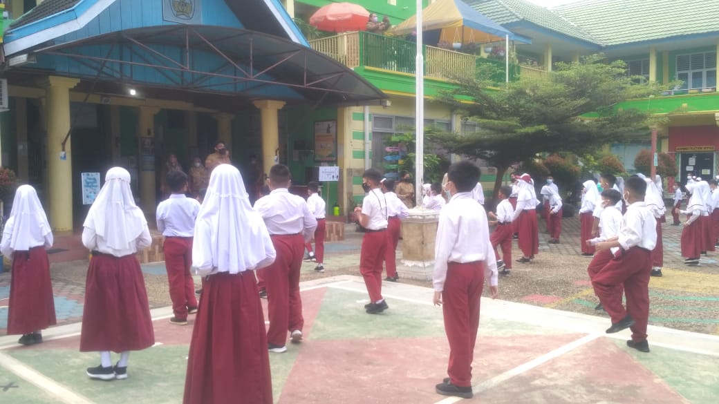 Menarik juga, sebelum siswa SD Negeri 47 Kota Jambi melaksanakan PTM di kelas masing-masing, para siswa dijemur terlebih dahulu dan dengan diiringi musik untuk melakukan senam pagi.