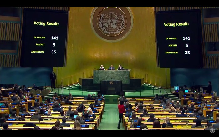 Negara-negara yang tidak setuju dengan resolusi ini adalah Rusia, Belarusia, Korea Utara, Suriah, dan Eritrea.