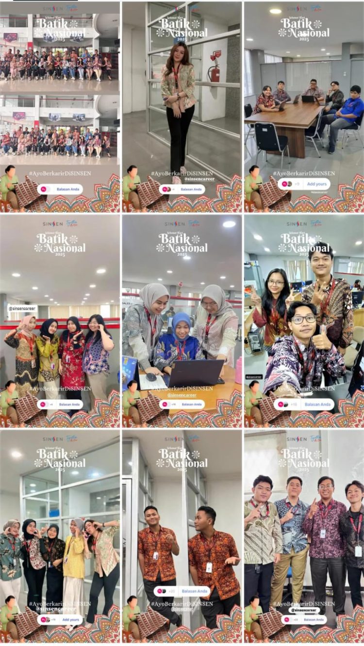 Kegiatan ini menjadi salah satu bentuk nyata komitmen Sinsen dalam menumbuhkan rasa nasionalisme dan kebanggaan terhadap warisan budaya Indonesia, sekaligus memperkuat nilai kebersamaan antar karyawan. Tak hanya menampilkan keindahan batik secara langsung di tempat kerja, Sinsen juga menghadirkan semangat digital melalui aktivitas kreatif di media sosial.